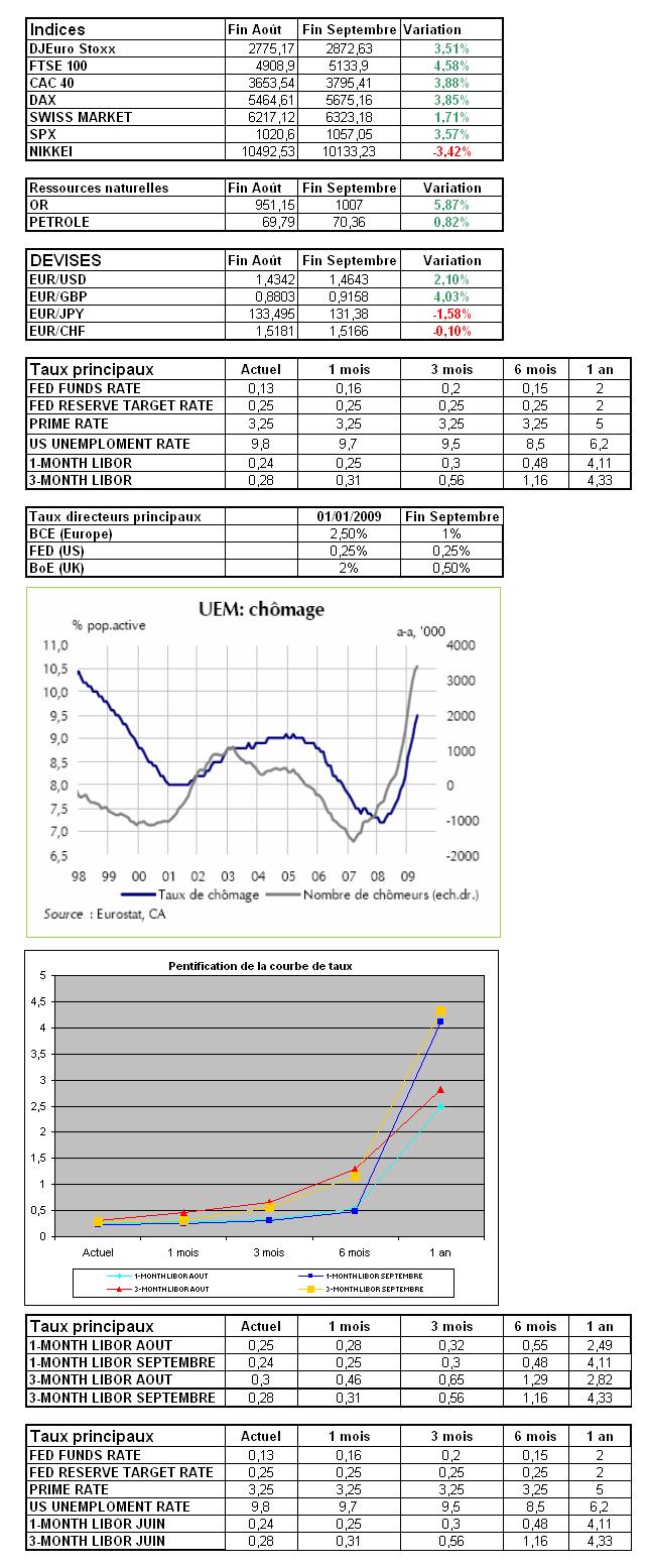 Le mois de septembre marquait le 1er anniversaire de la faillite de la banque Lehman Brothers, et malgré cela les marchés mondiaux, hormis le Japon, ont repris leur mouvement haussier durant le mois de septembre, la palme revenant au FTSE avec une croissance de 4.58%. Ce mois a notamment permis de confirmer les chiffres macroéconomiques positifs de cet été : un exemple avec le PIB de la zone Euro qui résiste mieux qu’escompté grâce à la fermeté de la consommation des ménages et au soutien des dépenses publiques. Le FMI a par ailleurs répété son optimisme en estimant que la reprise pourrait intervenir plus tôt que prévu grâce au restockage en cours et aux stimuli budgétaires. Ces propos corroborent ceux de Ben Bernanke, le président de la FED, qui estime que « la récession est probablement derrière nous ». Ce contexte de croissance permet d’assister à un retour des opérations de fusions – acquisitions en raison de valorisations plutôt raisonnables et un contexte de génération de cash-flows élevés. Les marchés des pays en voie de développement ont eux aussi connu une évolution similaire, avec des hausses de plus de 7% pour les marchés coréens, thaïlandais, indonésiens et indiens, en partie grâce à l’amélioration de la balance commerciale de ces économies et l’appréciation de leur devise.